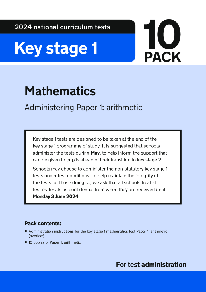 Key Stage 1 Optional Testing 2024 2024 KS1 Administering Paper 1 arithmetic 2024 KS1 Administering Paper 2 reasoning 2024 KS1 Maths test mark schemes 2024 KS1 Paper 1 arithmetic 2024 KS1 Paper 2 reasoning KS1 2024 Scaled Scores