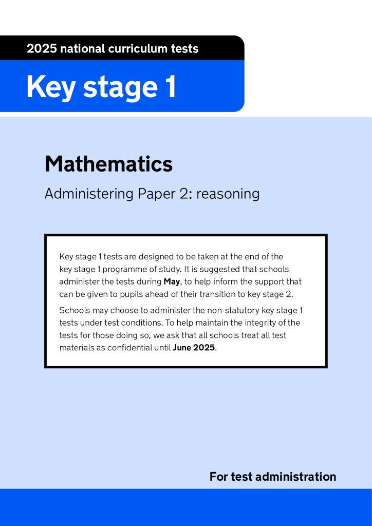 Key Stage 1 Optional Testing 2025 2025 key stage 1 mathematics Paper 1: arithmetic 2025 key stage 1 mathematics Paper 2: reasoning Paper 1 Administration guidance Paper 2 Administration guidance Papers 1 and 2 mark scheme KS1 scaled scores