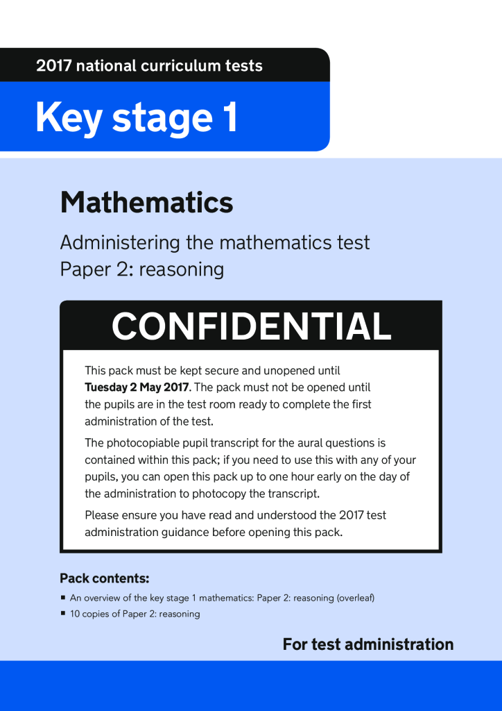 Key Stage 1 Testing 2017 2017 KS1 mathematics mark schemes 2017 KS1 mathematics paper 1 arithmetic administration 2017 KS1 mathematics paper 1 arithmetic 2017 KS1 mathematics paper 2 reasoning administration 2017 KS1 mathematics paper 2 reasoning 2017 KS1 Scaled score conversion tables