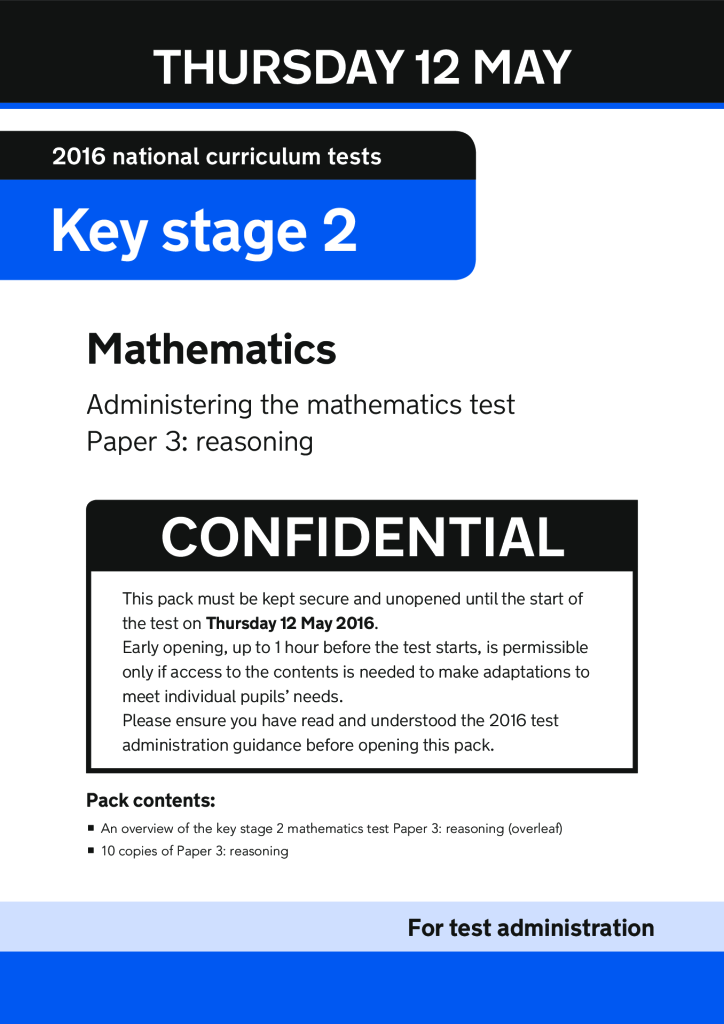 Key Stage 2 Testing 2016 2016 KS2 mathematics markschemes 2016 KS2 mathematics Paper 1 arithmetic 2016 KS2 mathematics Paper 2 reasoning 2016 KS2 mathematics Paper 3 reasoning 2016 KS2 mathematics test Paper 1 admin instructions 2016 KS2 mathematics test Paper 2 admin instructions 2016 KS2 mathematics test Paper 3 admin instructions